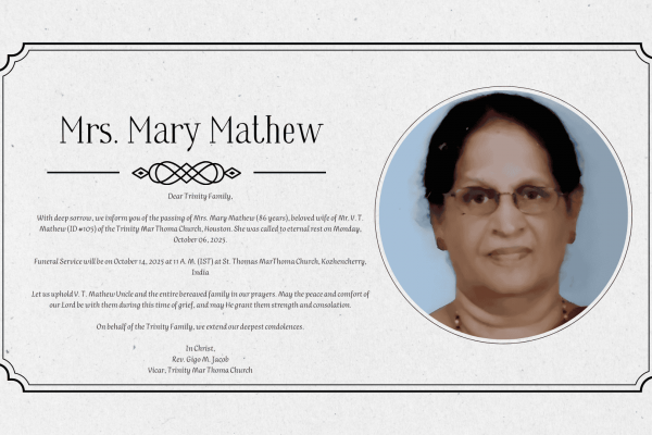 Dear Trinity Family, With deep sorrow, we inform you of the passing of our dear Mrs. Saramma Sleeba (83 years), beloved wife of Mr. […]